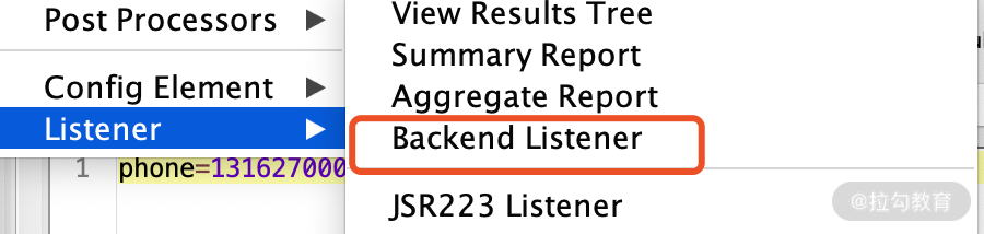 (1)添加核心插件,在 listener 组件中选择 Backend Listener(如下图所示)。