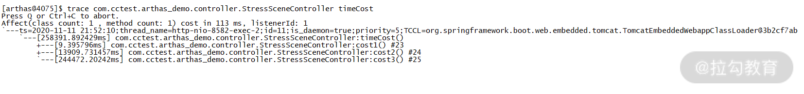部署之后我们使用 trace 来查找最耗时的方法,在此过程中需要知道包名、类名,以及方法的名字。上述代码方法所在包名为 com.cctest.arthas_demo.controller,类名为 StressSceneController,所以我们需要输入如下 trace 命令: