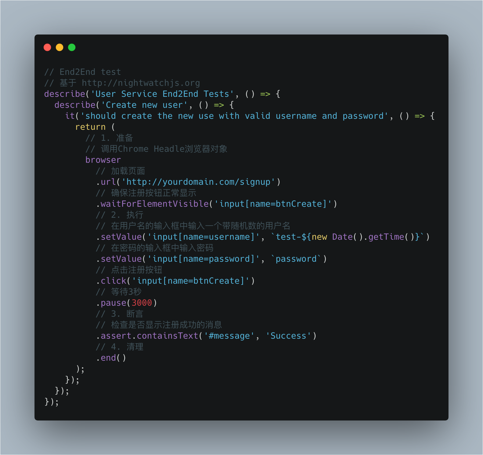 如果说要对用户注册写一个端对端测试的例子,那么看起来会像这样: