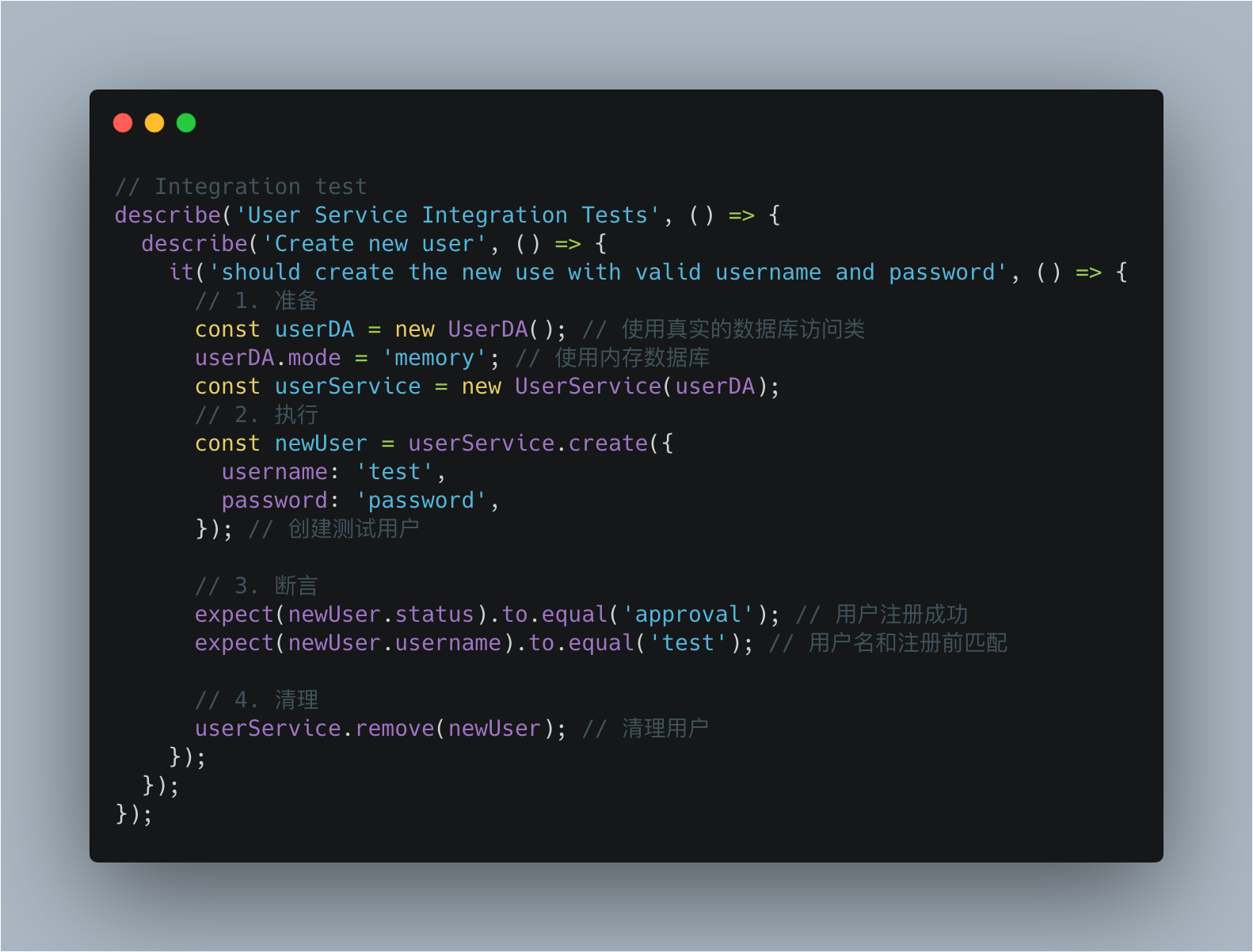 如果说要对用户注册的功能写集成测试,那么就会同时测试业务逻辑层的 UserService 类和数据访问层的 UserDA 类。如下所示: