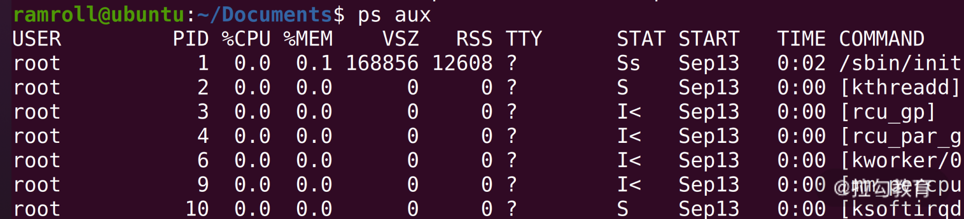 • CMD 是进程启动时的命令,如果不是一个 Shell 命令,而是用方括号括起来,那就是系统进程或者内核过程。