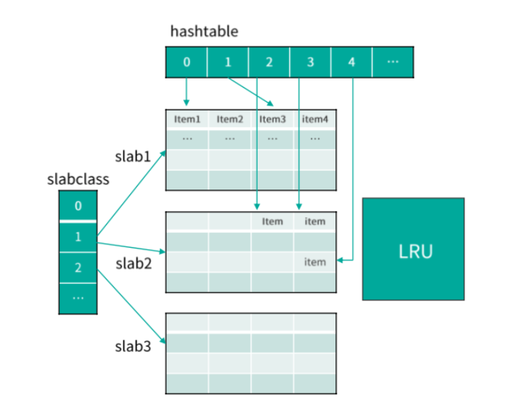 如下图,一组具有相同 chunk size 的所有 slab,就组成一个 slabclass。不同 slabclass 的 chunk size 按递增因子一次增加。Mc 就通过 slabclass 来管理一组 slab 内的存储空间的。每个 slabclass 内部有一个 freelist ,包含这组 slab 里所有空闲的 chunk,当需要存储数据时,从这个 freelist 里面快速分配一个 chunk 做存储空间。当 Item 数据淘汰剔除时,这个 Item 所在的 chunk 又被回收至这个 freelist。