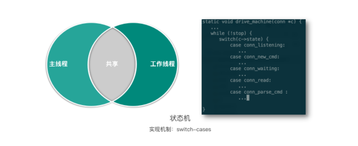 工作线程监听到主线程的管道通知后,会从连接队列弹出一个新连接,然后就会创建一个 conn 结构体,注册该 conn 读事件,然后继续监听该连接上的 IO 事件。后续这个连接有命令进来时,工作线程会读取 client 发来的命令,进行解析并处理,最后返回响应。工作线程的主要处理逻辑也是在状态机中,一个名叫 drive_machine 的函数。