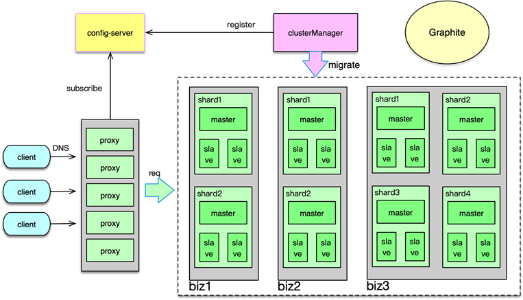 ClusterManager 是一个运维后台。主要用于运维工作,如后端资源、Proxy 的实例部署,配置变更,版本升级等。也用于数据的集群管理,clusterManager 内部会存储业务数据的集群映射,并在必要时进行数据迁移和故障转移。迁移采用 slot 方式,可以根据负载进行迁移流量控制,同时会探测集群内的节点状态,如在 wredis 的 master 异常后,从 slave 中选择一个新的master,并重建主从关系。clusterManager 还支持业务访问的 Proxy 域名管理,监控集群节点的实例状态,监控业务的 SLA 指标,对异常进行报警,以便运维及时进行处理。