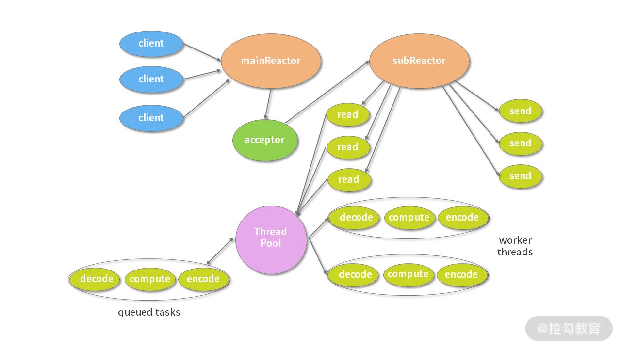 主从多线程模型由多个 Reactor 线程组成,每个 Reactor 线程都有独立的 Selector 对象。MainReactor 仅负责处理客户端连接的 Accept 事件,连接建立成功后将新创建的连接对象注册至 SubReactor。再由 SubReactor 分配线程池中的 I/O 线程与其连接绑定,它将负责连接生命周期内所有的 I/O 事件。