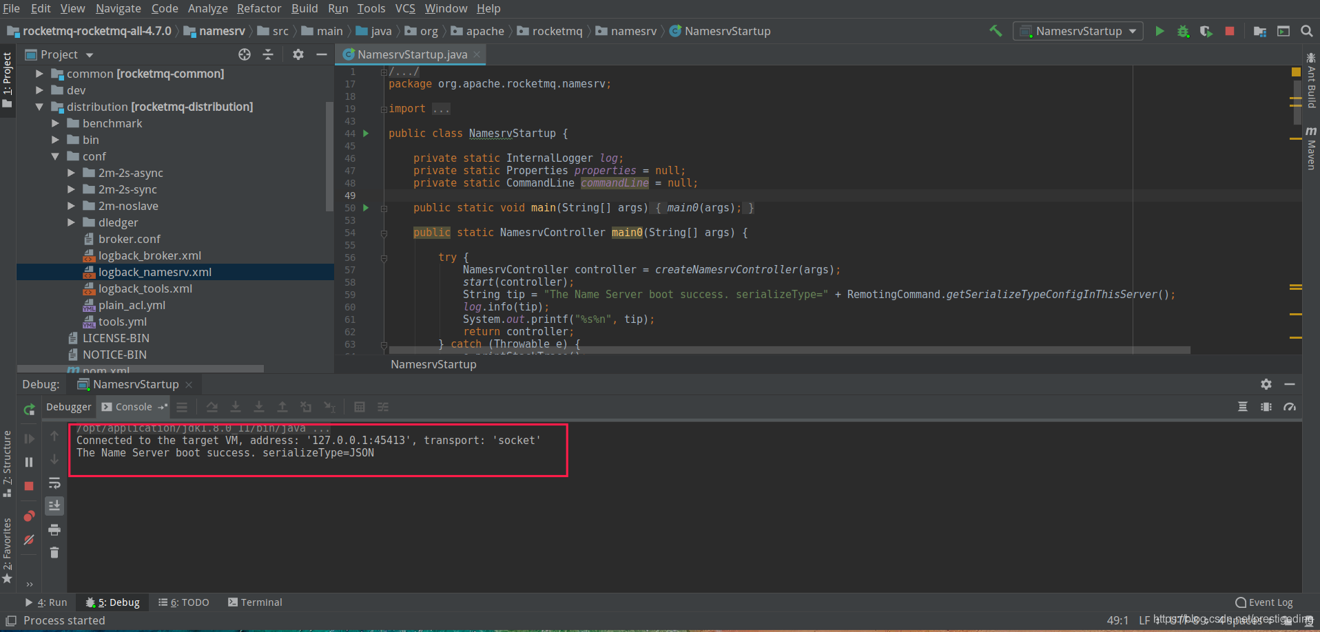 Step4:以 Debug 方法运行 NamesrvStartup,执行效果如下图所示,表示启动成功