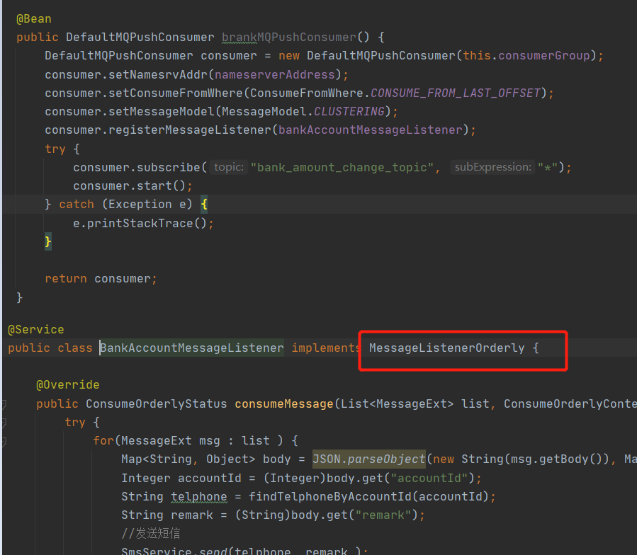 顺序消费的事件监听器为 MessageListenerOrderly,表示顺序消费。