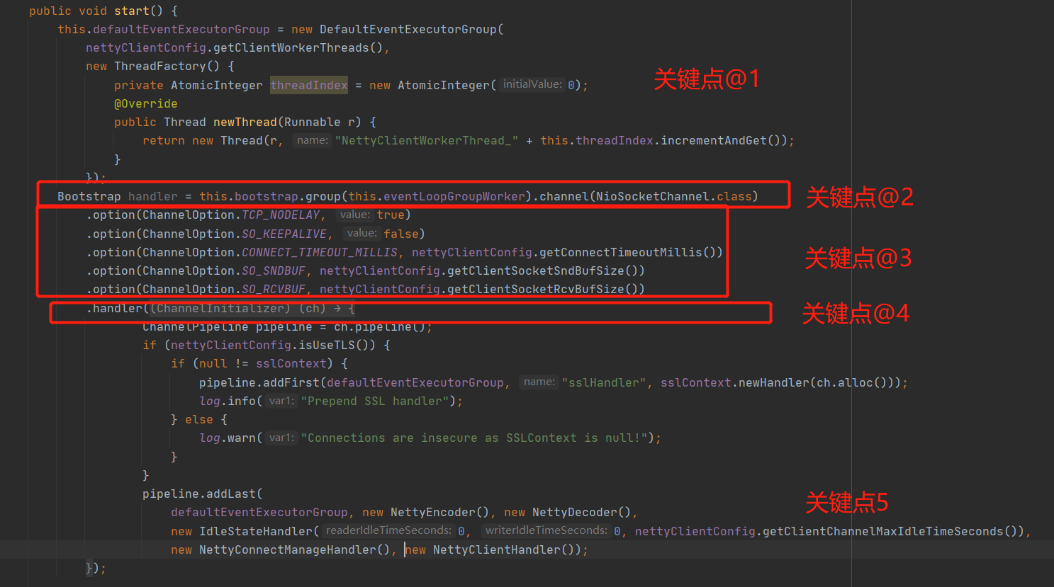 在 RocketMQ 中客户端的实现类:NettyRemotingClient。其创建核心代码被封装在 start 方法中,其代码截图如下图所示: