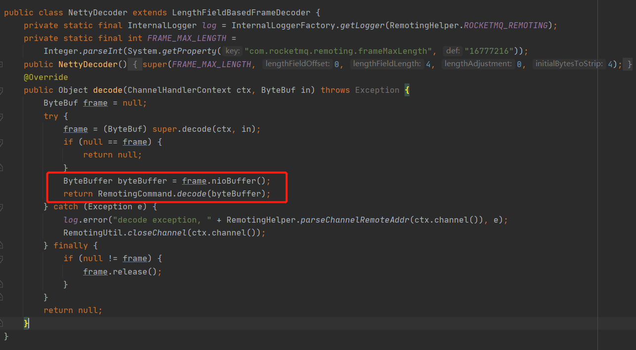 • NettyDecoder:RocketMQ 请求解码器,即协议解码器。