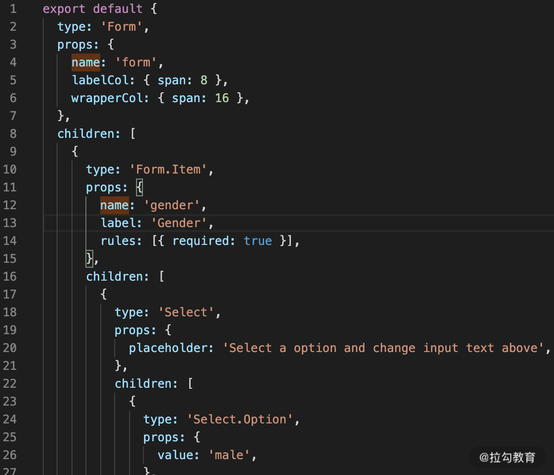 下图中的代码就是组件语法树示例(完整的示例代码参见 07_low_code),我们通过编写一个简单的 JSON 语法树以及对应的编译器,来展示低代码开发的模式。