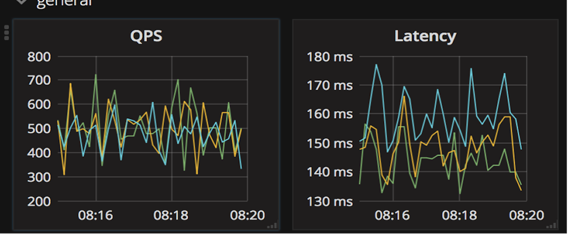 现在我们还可以看一下,在实际生产环境中,一个应用程序跑在使用 veth 接口的容器中,跟这个应用程序跑在使用 ipvlan 接口的容器中,两者的网络延时差异是怎样的。