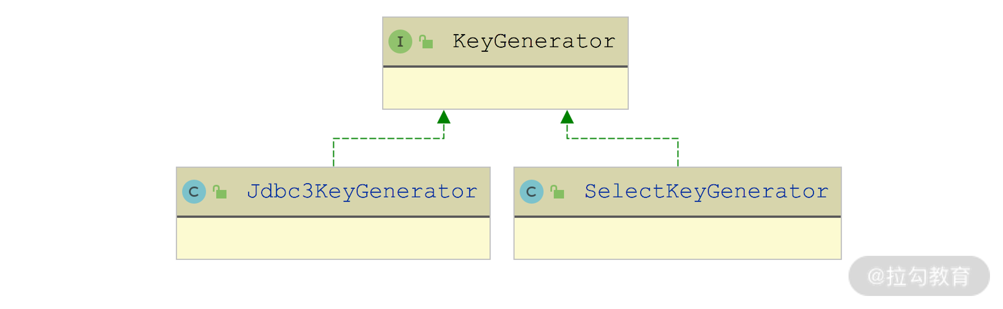 我们知道不同数据库的自增 id 生成策略并不完全一样。例如,我们常见的 Oracle DB 是通过sequence 实现自增 id 的,如果使用自增 id 作为主键,就需要我们先获取到这个自增的 id 值,然后再使用;MySQL 在使用自增 id 作为主键的时候,insert 语句中可以不指定主键,在插入过程中由 MySQL 自动生成 id。KeyGenerator 接口支持 insert 语句执行前后获取自增的 id,分别对应 processBefore() 方法和 processAfter() 方法,下图展示了 MyBatis 提供的两个 KeyGenerator 接口实现: