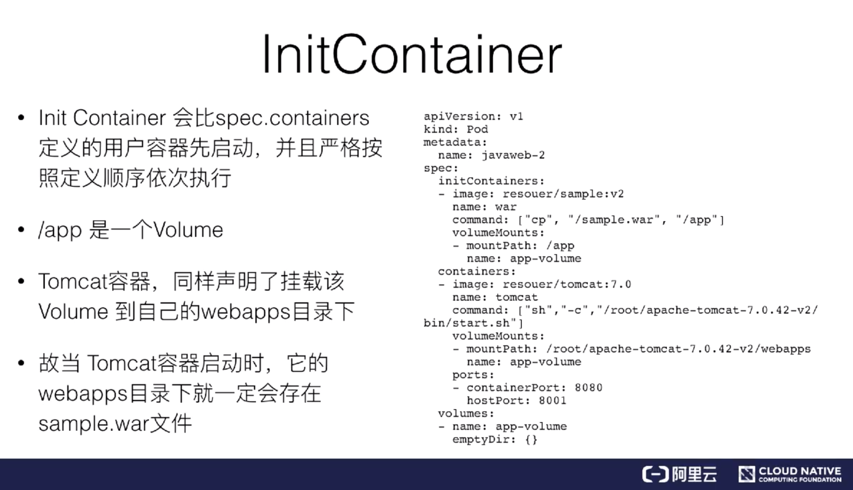 还是同样一个例子:在上图的 yaml 里,首先定义一个 Init Container,它只做一件事情,就是把 WAR 包从镜像里拷贝到一个 Volume 里面,它做完这个操作就退出了,所以 Init Container 会比用户容器先启动,并且严格按照定义顺序来依次执行。