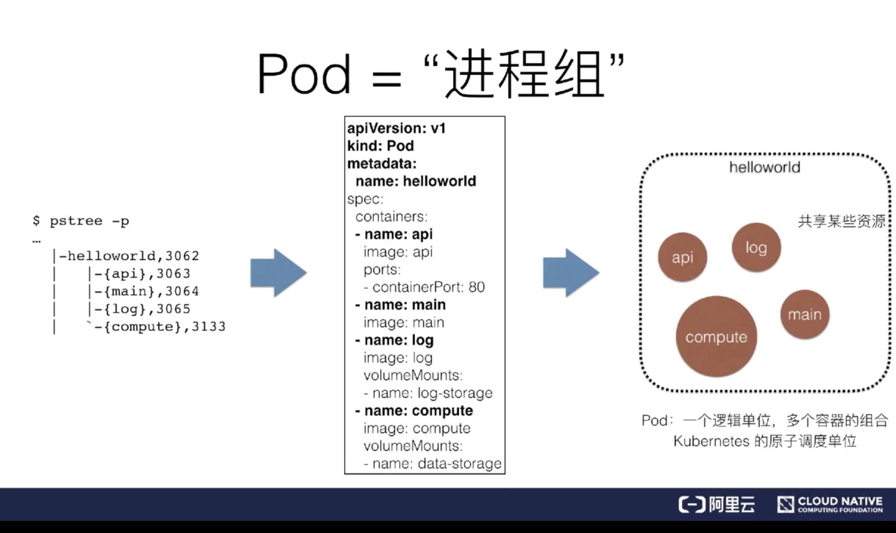 前面提到的,由四个进程共同组成的一个应用 Helloworld,在 Kubernetes 里面,实际上会被定义为一个拥有四个容器的 Pod,这个概念大家一定要非常仔细的理解。