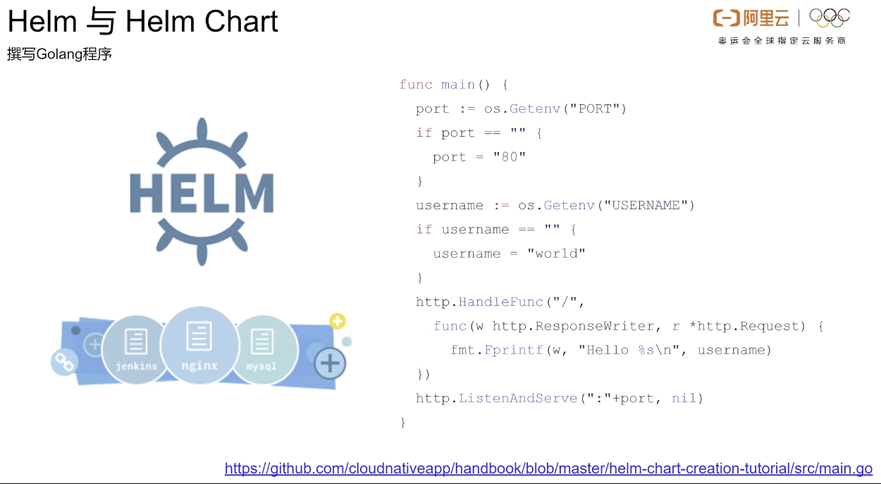 打包用的 Dockerfile 是长这个样子的。在这里面,我们首先对 Golang 代码进行编译,然后将编译后的程序放到 03:53 的一个镜像中来缩小镜像的体积。我们看到上文所说的两个环境变量只有 port 在这里面进行一个设置,username 将会在后续作为应用的一个参数报告给用户,所以在这里面我们先不做设置,在 docker 构建好镜像之后,我们把这个镜像上传到仓库中,比如说我们可以上传到 Docker Helm,或者是阿里云镜像仓库中。
