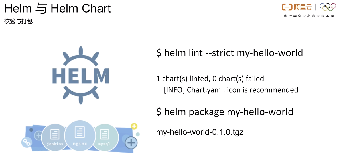 在我们准备好这些应用后,就可以使用 helm lint 命令,来粗略检查一下我们制作的这个 chart 有没有语法上的错误,如果没有问题的话,就可以使用 Helm package 命令,对我们的 chart 文件包进行一个打包。打包之后,我们就可以得到一个 tar 的应用包了,这个就是我们所要发布的一个应用。
