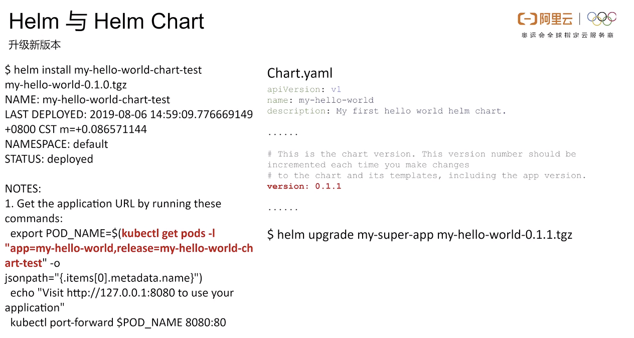同样,如果用户编写自己的 my-values.yaml 文件,也可以把这个文件在 install 的时候设置起来,这样的话,文件中的参数会覆盖掉原有的一些参数。如果用户不想重新去 install 一个新的 app,而是想要升级原来的 app,他也只需要用这个 helm upgrade 的命令把这个 Helm install 这个命令替换掉就可以了。