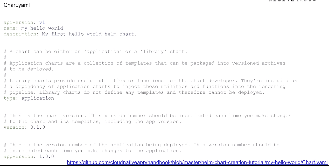 在 Charts.yaml 里面,有两个和版本相关的字段,其中 version 指的是我们当前这个 chart 应用包的版本,而另外一个 appVersion 则指的是我们内部所使用的,比如说在这里面就是我们内部所使用的 Golang 这个程序,我们给它打一个 tag 这个版本。