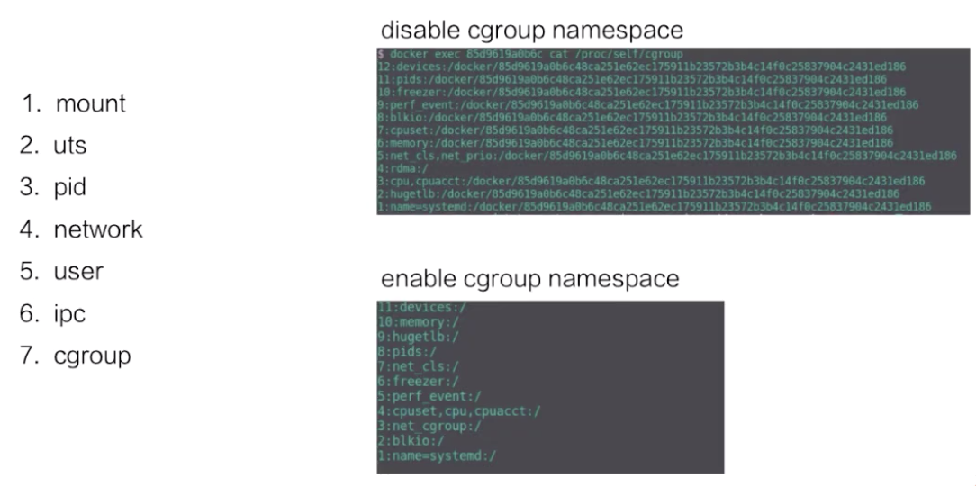 namespace 是用来做资源隔离的,在 Linux 内核上有七种 namespace,docker 中用到了前六种。第七种 cgroup namespace 在 docker 本身并没有用到,但是在 runC 实现中实现了 cgroup namespace。