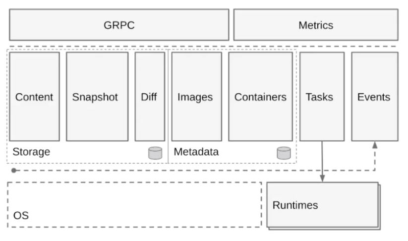 接下来讲一下容器引擎,我们基于 CNCF 的一个容器引擎上的 containerd,来讲一下容器引擎大致的构成。下图是从 containerd 官网拿过来的一张架构图,基于这张架构图先简单介绍一下 containerd 的架构。