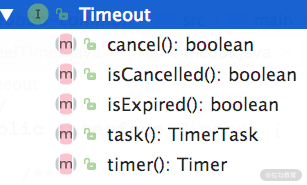 Timer 接口定义了定时器的基本行为,如下图所示,其核心是 newTimeout() 方法:提交一个定时任务(TimerTask)并返回关联的 Timeout 对象,这有点类似于向线程池提交任务的感觉。