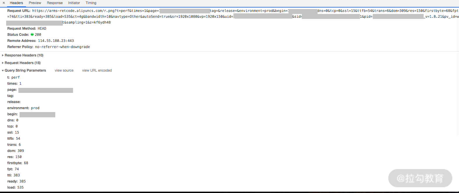 页面加载完成之后,会发送 HEAD 请求来上报数据。其中我们可以清楚的看到,在请求参数中包含 DNS、TCP、SSL、DOM、LOAD 等信息,分别代表 DNS 寻找、TCP 建立连接、SSL 握手这类,我在“05 | 监控指标:如何通过分析数据快速定位系统隐患?(上)”中讲到的通用指标,也包含 DOM 元素加载时间这类网页中的统计指标信息。如下所示: