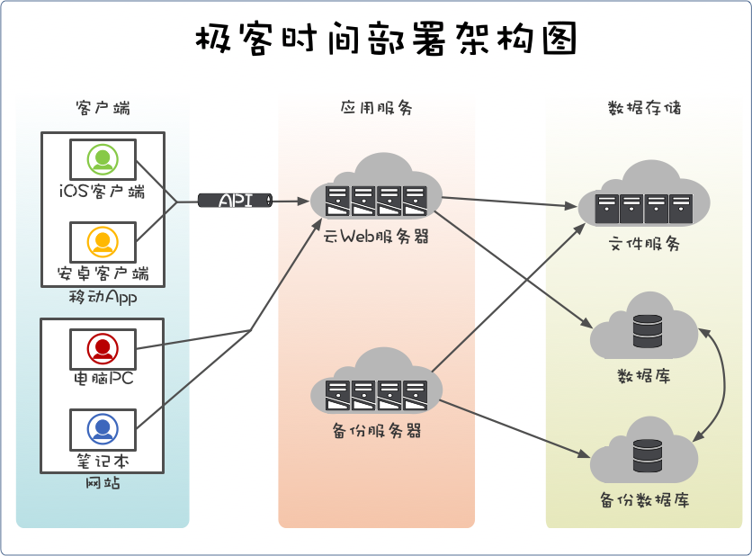 极客时间服务端,主要包含两部分内容,一个是给手机客户端提供的 API 服务,还有就是网站需要的 Web 服务。第一个版本其实访问量并不大,我们完全可以把 API 服务和网站服务合并成一个服务。另外专栏的内容,文字内容涉及数据库的存储,同时音频涉及文件存储。