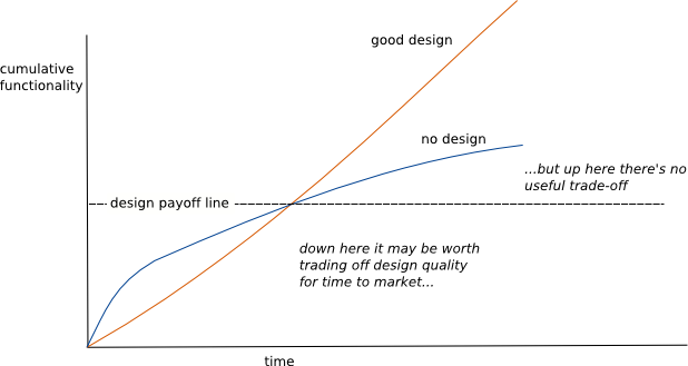 Martin Fowler 画过一张图,来形象的描述了设计、时间和开发速度的关系。没有设计直接写代码,从短期看确实是节约时间的,但是跨过一个临界点后,开发速度会急剧下降。