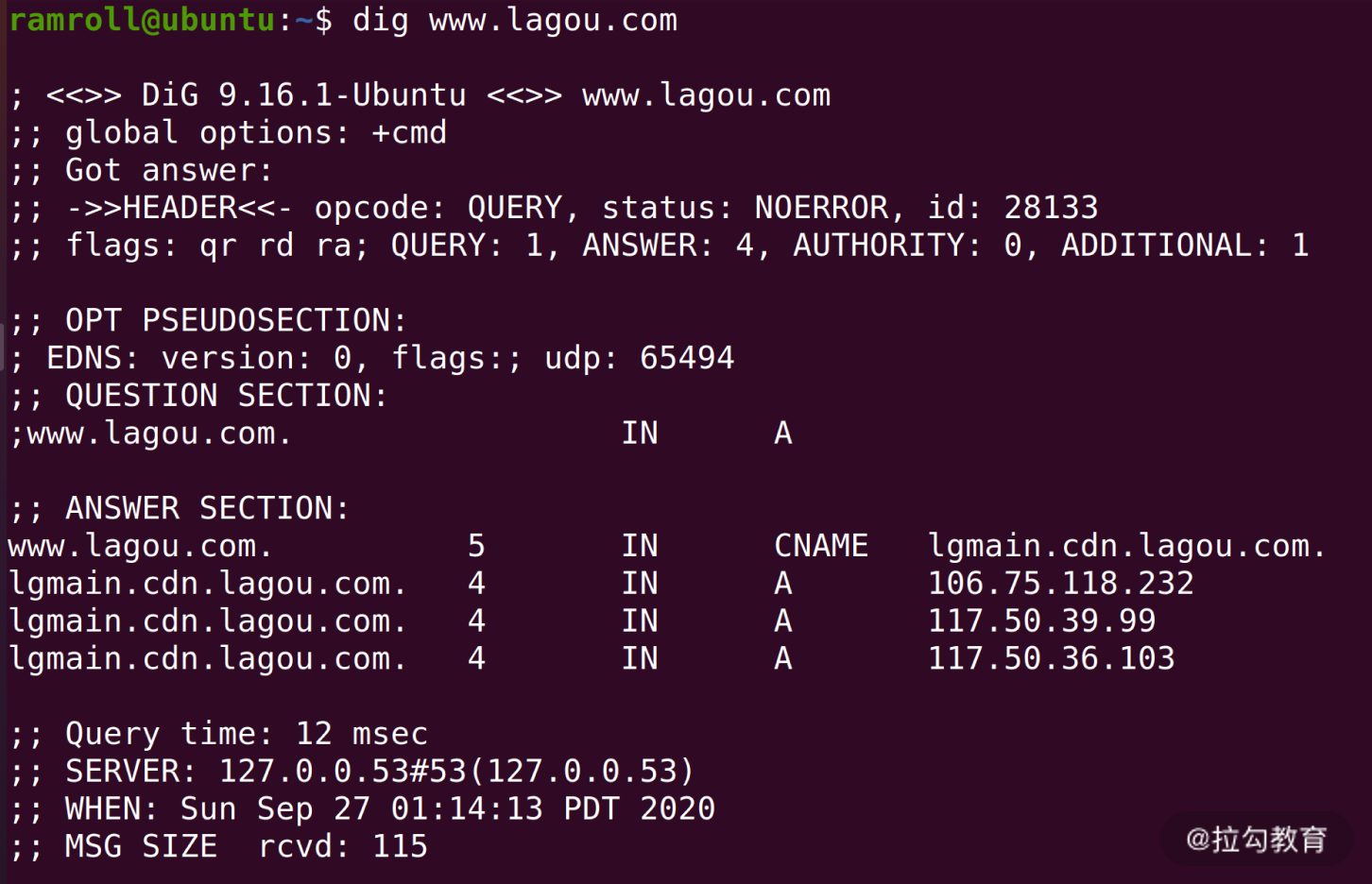 dig指令也是一个做 DNS 查询的。不过dig指令显示的内容更详细。下图是dig拉勾网的结果。
