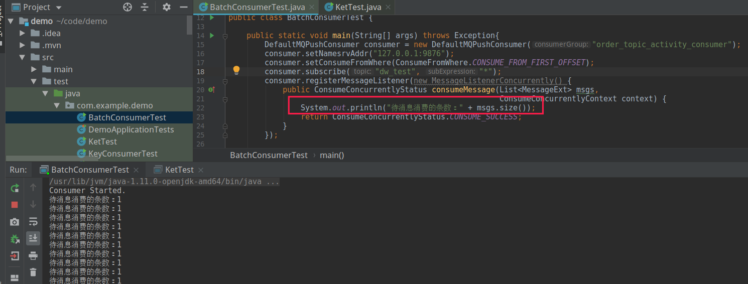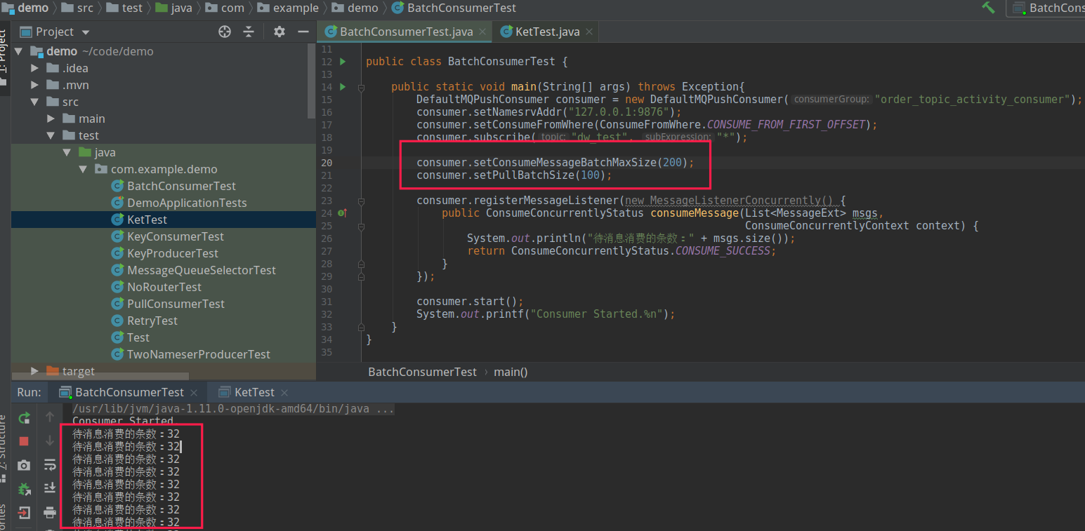 默认情况下一次消息会拉取 32 条消息,但业务监听器收到的消息默认一条,为了更直观对其了解,现给出如下示例代码: