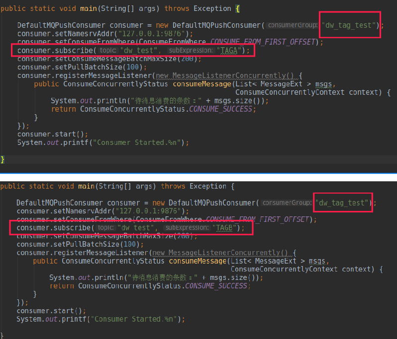 上面的错误关键点在:两个 JVM 进程中创建的消费组名称都是 dw_tag_test,但其中一个消费组订阅了 TAGA,另外一个消费组订阅了 TAGB,这样会造成消息丢失(即部分消息未被消费),其证明如下图所示: