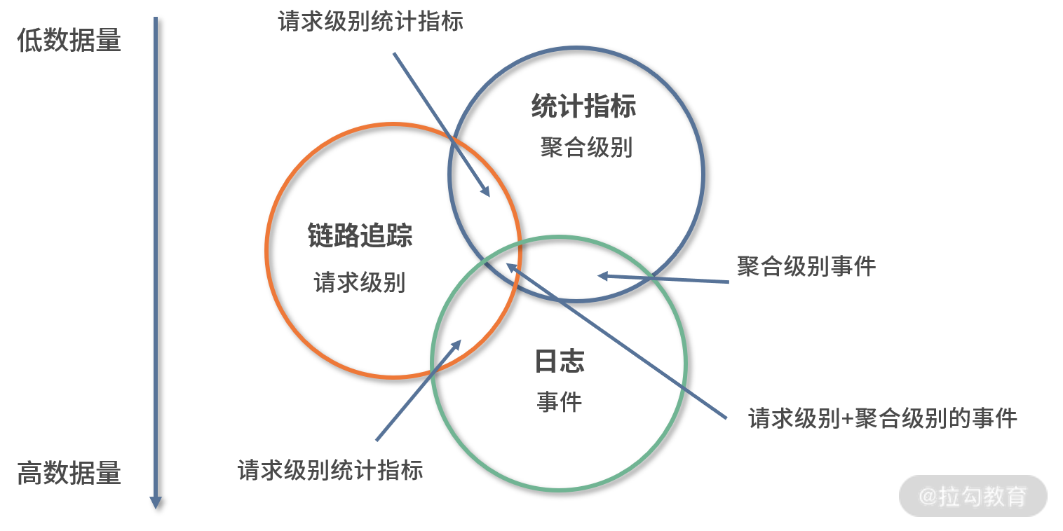 根据这 2 个级别,我们可以对上面的 3 个内容加以细化,其中链路追踪是请求级别,因为它和每个请求都挂钩;日志统计指标可以是请求级别,也可以是聚合级别,因为它们可能是真实的请求,也可能是系统在对自身诊断时记录下来的信息。