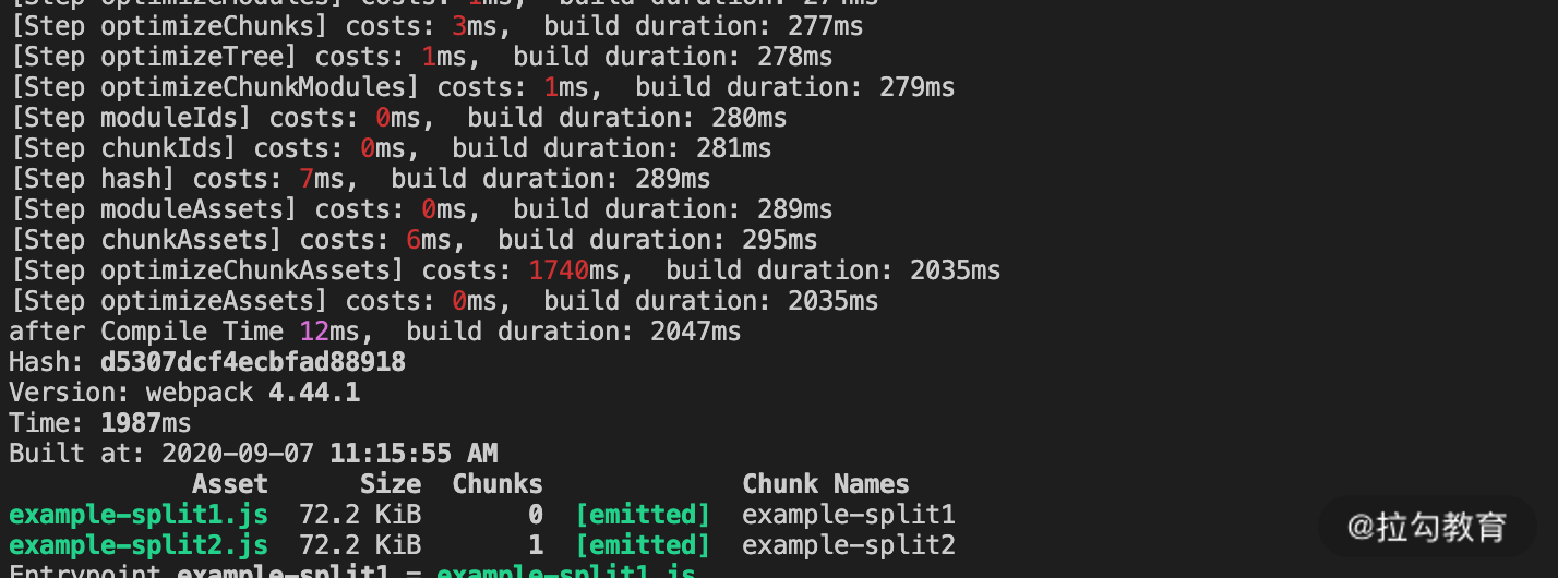 Split Chunks 有诸多优点,例如有利于缓存命中(下节课中会提到)、有利于运行时的持久化文件缓存等。其中有一类情况能提升后续环节的工作效率,即通过分包来抽离多个入口点引用的公共依赖。我们通过下面的代码示例(npm run build:split)来看一下。