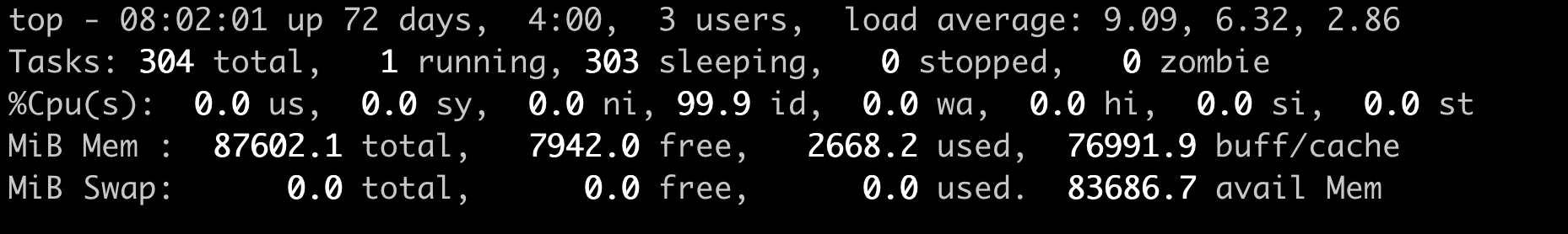 我们发现程序跑了几分钟之后,前 1 分钟的 Load Average 差不多从 0 增加到了 2.16,节点上 CPU Usage 几乎为 0,idle 为 99.8%。