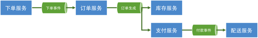 如下图所示,这是一个订单处理流程。下单服务通知订单服务有订单要处理,而订单服务生成订单后发出通知,库存服务和支付服务得到通知后,一边是占住库存,另一边是让用户支付,等待用户支付完成后通知配送服务进行商品配送。