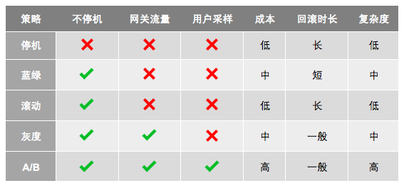 部署应用有很多种方法,实际采用哪种方式取决于需求和预算。当发布到开发或者模拟环境时,停机或者滚动部署是一个好选择,因为干净和快速。当发布到生产环境时,滚动部署或者蓝绿部署通常是一个好选择,但新平台的主流程测试是必须的。