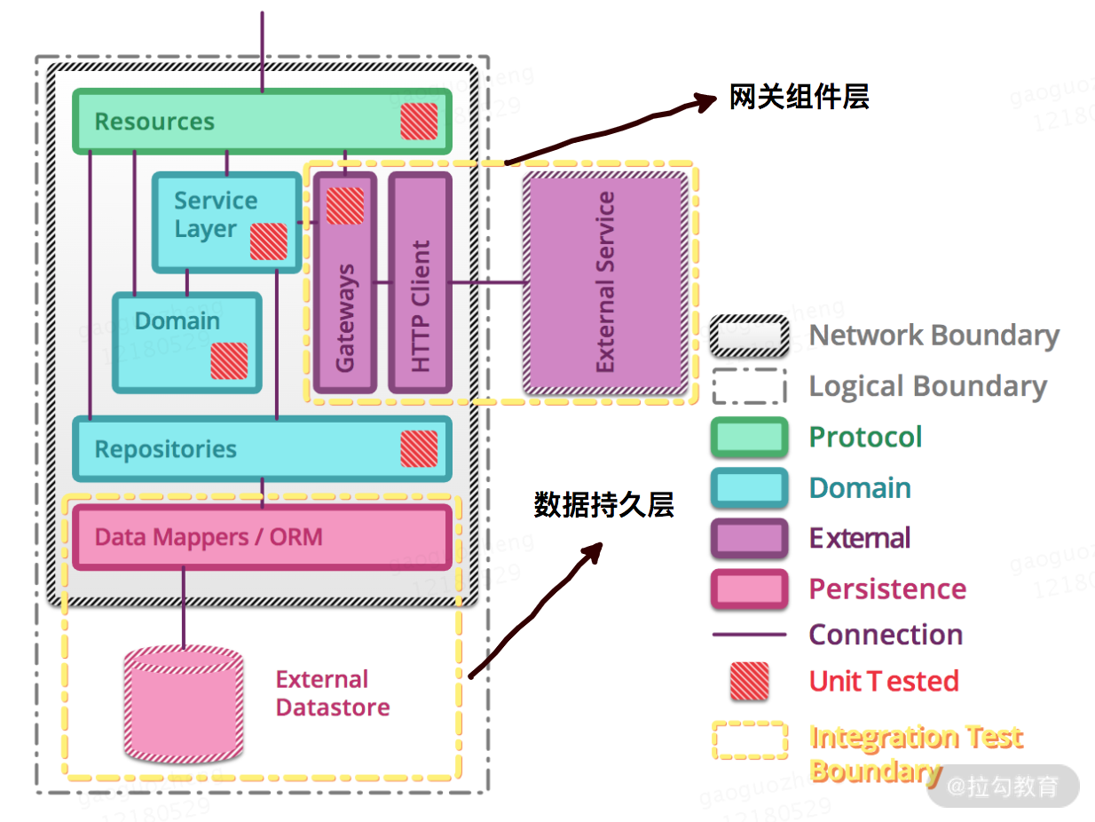 如上图所示,网关组件层(Gateways+Http Client+External Service)包含了访问外部服务的逻辑,通常包含一个 HTTP/S 的客户端,客户端会连接到系统中另一个微服务或外部服务。数据持久层(Date Mappers/ORM)用于连接外部数据存储。