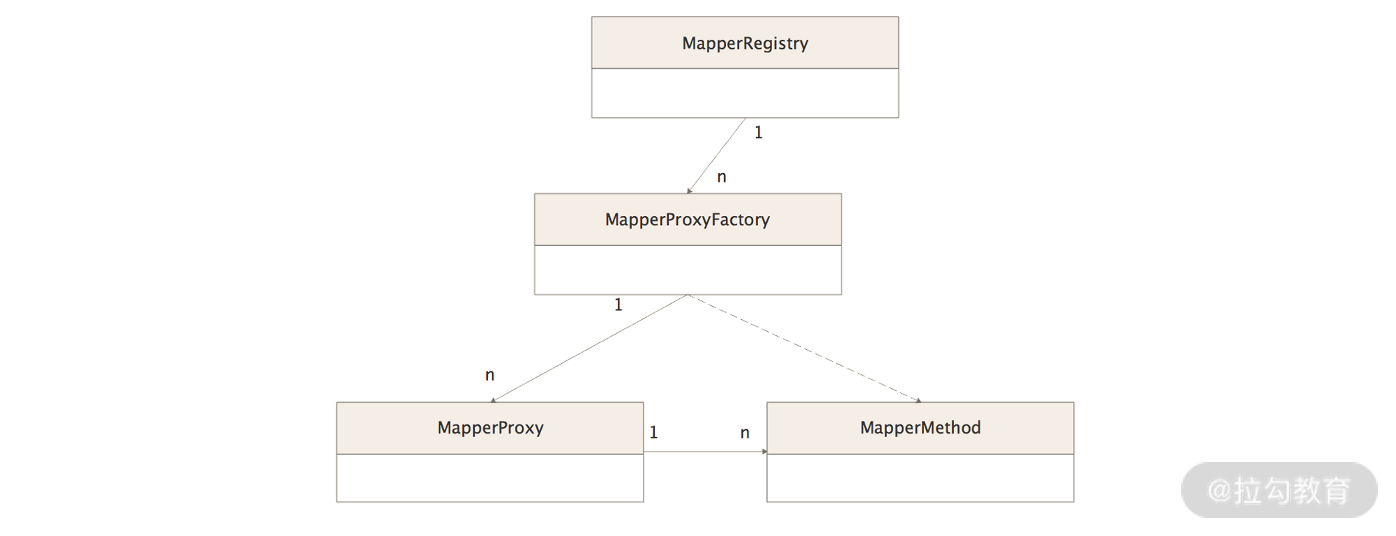 • 然后,分析了 MapperProxy 和 MapperProxyFactory,其中 MapperProxyFactory 使用 JDK 动态代理方式为相应的 Mapper 接口创建了代理对象,MapperProxy 则封装了核心的代理逻辑,将拦截到的目标方法委托给对应的 MapperMethod 处理。