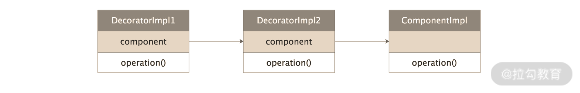 • Decorator 抽象类:所有装饰器的父类,实现了 Component 接口,其核心不是提供新的扩展能力,而是封装一个 Component 类型的字段,也就是被装饰的目标对象。需要注意的是,这个被装饰的对象可以是 ComponentImpl 对象,也可以是 Decorator 实现类的对象,之所以这么设计,就是为了实现下图的装饰器嵌套。这里的 DecoratorImpl1 装饰了 DecoratorImpl2,DecoratorImpl2 装饰了 ComponentImpl,经过了这一系列装饰之后得到的 Component 对象,除了具有 ComponentImpl 的基础能力之外,还拥有了 DecoratorImpl1 和 DecoratorImpl2 的扩展能力。JDK IO 流体系中的 FilterInputStream 就扮演了 Decorator 的角色。