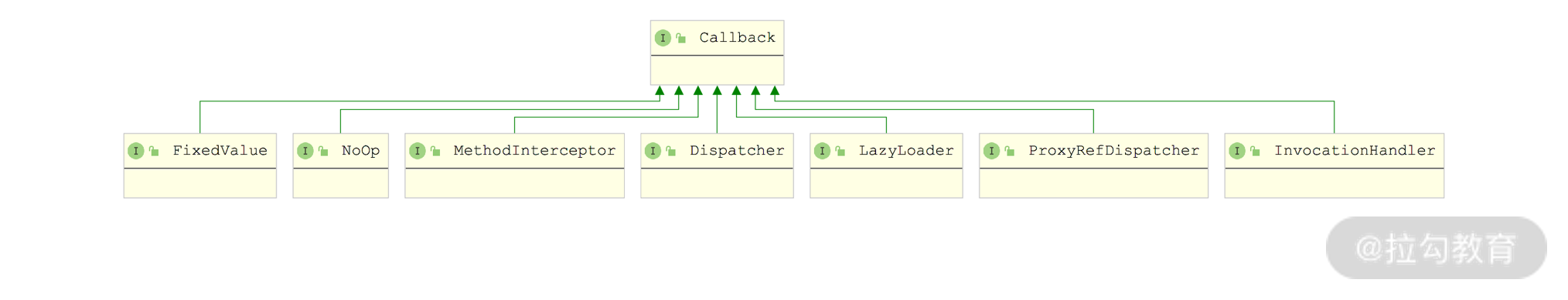 那如何使用 cglib 实现动态代理的功能呢?下面我们就来看看 cglib 的基础使用,在 cglib 中有一个关键的接口—— Callback 接口,它有很多子接口,如下图所示: