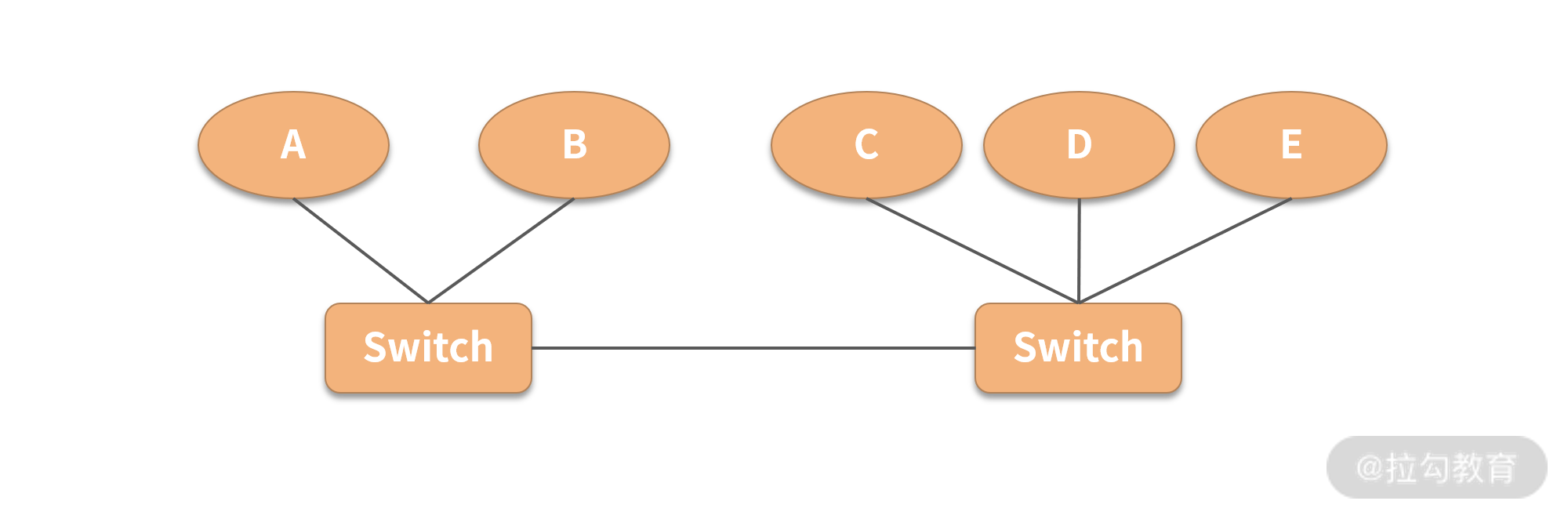 当这个连接失败后,A、B 还能连接彼此,但与 C、D 和 E 失去了联系。同样, C、D 和 E 也能知道彼此,但无法连接到A 和B。