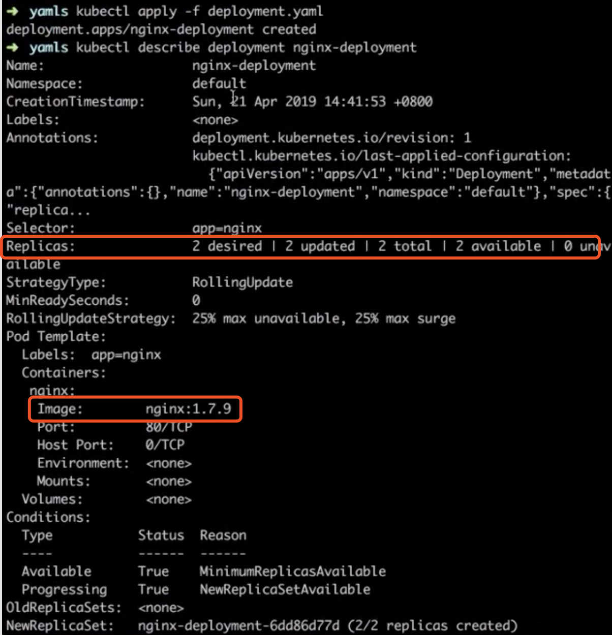 下图中可以看到:有一个 nginx-deployment 已经被生成了,它的 replicas 数目也是我们想要的、selector 也是我们想要的、它的 image 的版本也是 1.7.9。还可以看到,里面的 deployment-controller 这种版本控制器也是在管理它的生成。