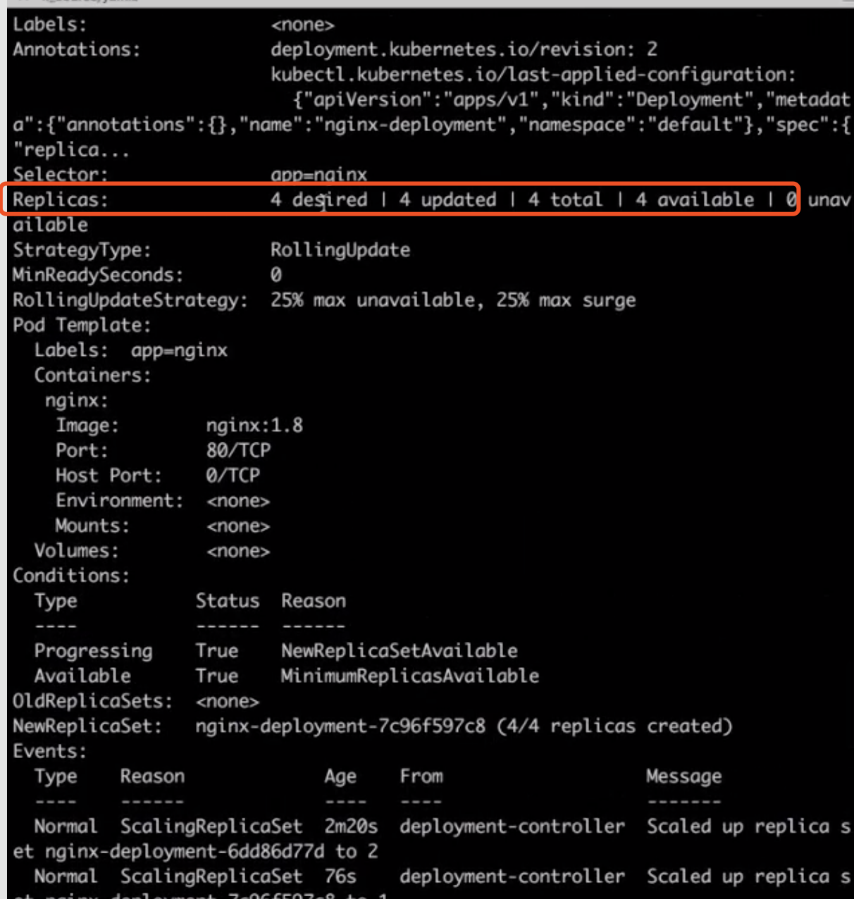 回到最开始的窗口,用 kubectl 去 apply 这个新的 deployment-scale.yaml 文件,在另外一个窗口上可以看到,当我们执行了 deployment-scale 操作之后,它的容器 Pod 数目从 2 变成了 4。我们可以再一次 describ 一下当前集群中的 deployment 的情况,可以看到它的 replicas 的数目从 2 变到了 4,同时也可以看到 controller 又做了几次新的操作,这个 scale up 成功了。