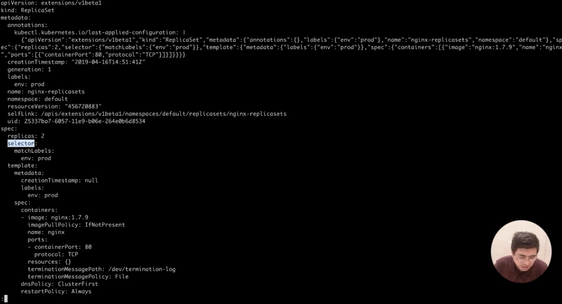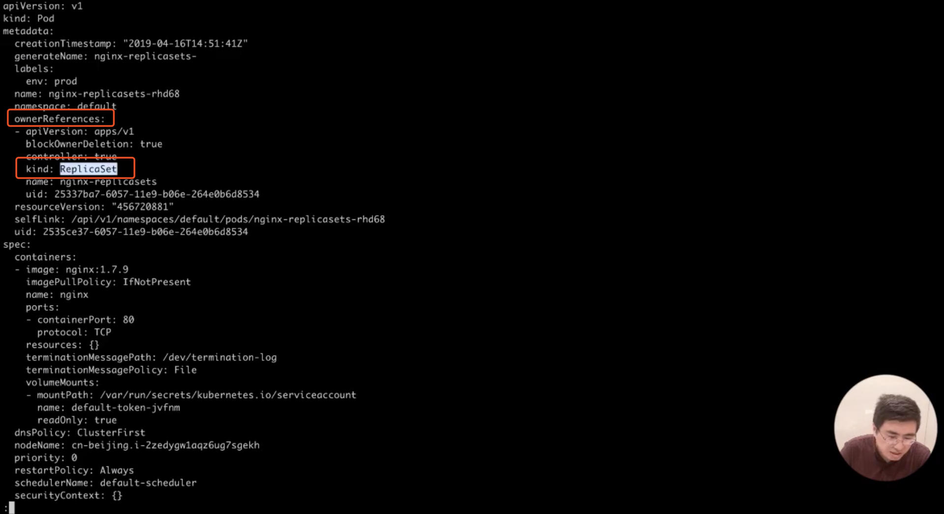 然后我们再演示一下看 Pod 的 Ownereference 是怎么出来的。原来的 Pod 都是直接通过创建 Pod 这个资源方式来创建的,这次换一种方式来创建:通过创建一个 ReplicaSet 对象来创建 Pod 。首先创建一个 ReplicaSet 对象,这个 ReplicaSet 对象可以具体查看一下;
