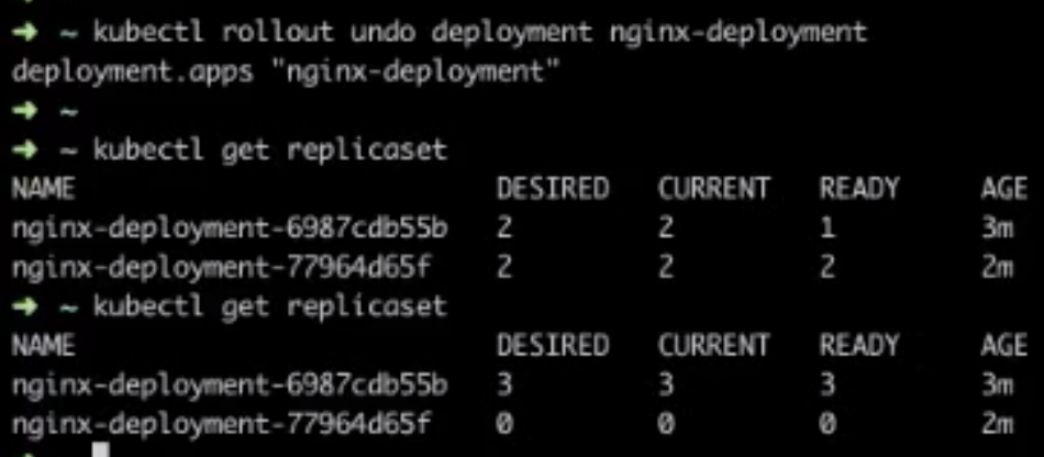 如果更新过程中发生问题的话,即所谓“一键”回滚,也就是说你通过一条命令或者一行修改能够将 Deployment 下面所有 Pod 更新为某一个旧版本 。