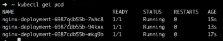 最前面一段:nginx-deployment,其实是 Pod 所属 Deployment.name;中间一段:template-hash,这里三个 Pod 是一样的,因为这三个 Pod 其实都是同一个 template 中创建出来的。