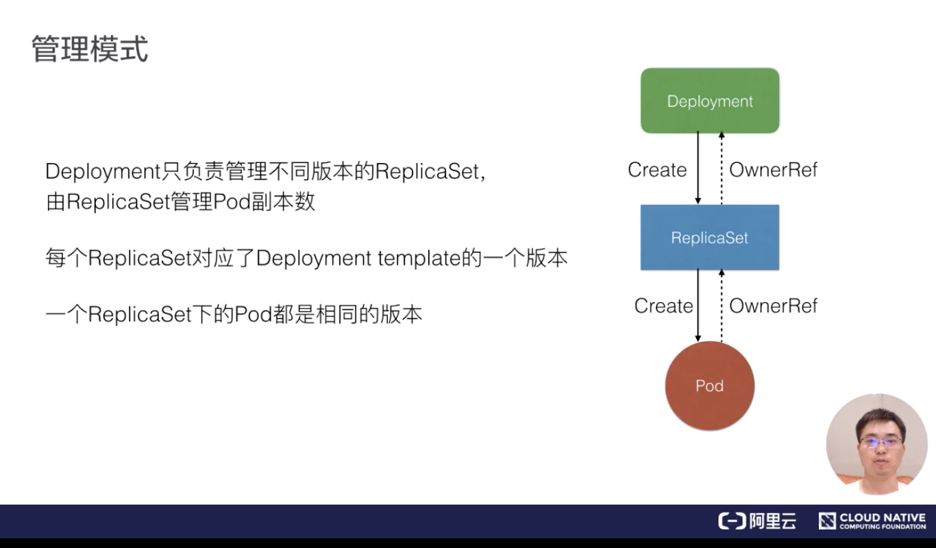 • Deployment 管理多版本的方式,是针对每个版本的 template 创建一个 ReplicaSet,由 ReplicaSet 维护一定数量的 Pod 副本,而 Deployment 只需要关心不同版本的 ReplicaSet 里要指定多少数量的 Pod;