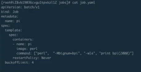 首先看一下 job.yaml。这是一个非常简单的计算 pi 的一个任务。使用 kubectl creat-f job.yaml,这样 job 就能提交成功了。来看一下 kubectl.get.jobs,可以看到这个 job 正在运行;get pods 可以看到这个 pod 应该是运行完成了,那么接下来 logs 一下这个 job 以及 pod。可以看到下图里面打印出来了圆周率。