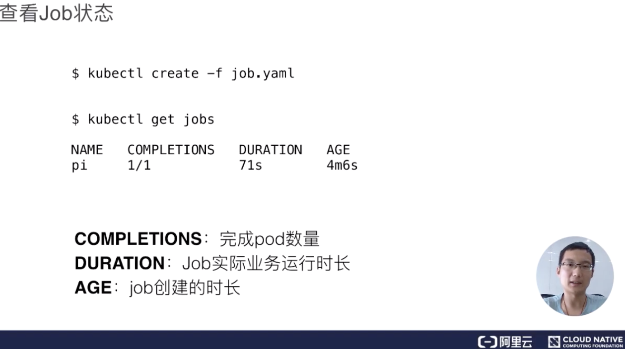 DURATION主要来看我们 Job 里面的实际业务到底运行了多长时间,当我们的性能调优的时候,这个参数会非常的有用。COMPLETIONS主要来看我们任务里面这个 Pod 一共有几个,然后它其中完成了多少个状态,会在这个字段里面做显示。