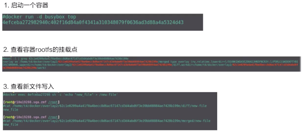 接下来看一下容器里面新文件的写入。docker exec 去创建一个新文件,diff 这个从上面可以看到,是它的一个 upperdir。再看 upperdir 里面有这个文件,文件里面的内容也是 docker exec 写入的。